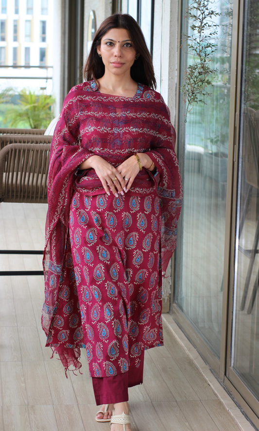 Berry & Blue Badmeri Prin Kurta, Kota Doria Dupatta & Cotton Pants