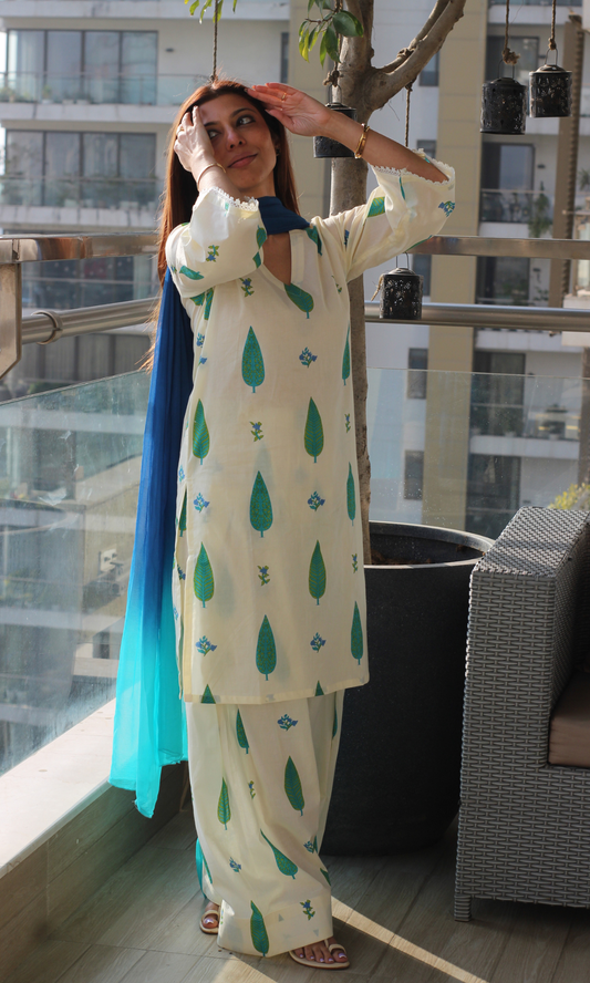 Linen Blend Off White Leaf Print Kurta, Dupatta & Cotton Pants