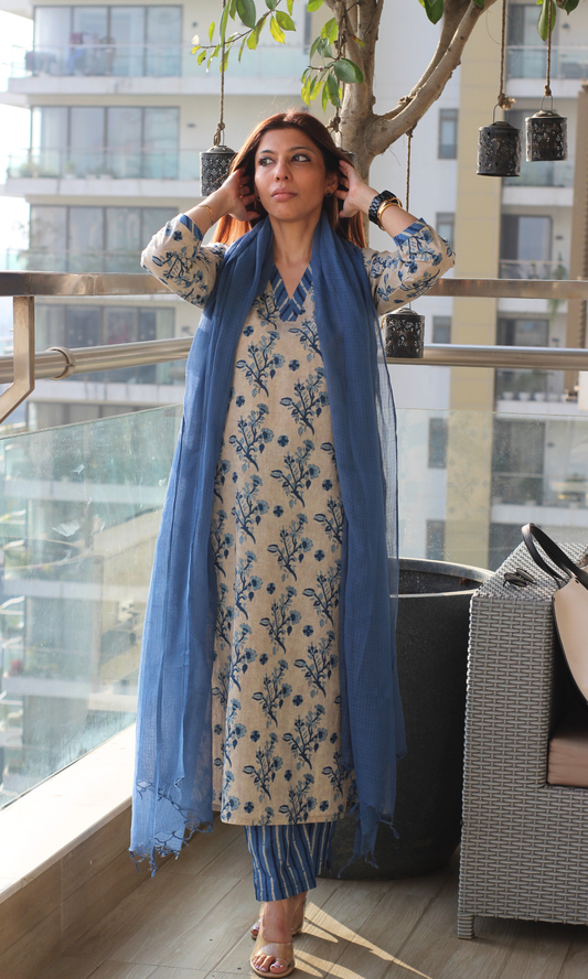 Cotton Oat Blue Block Print Kurta , Striped Pants & Kota Doria Dupatta