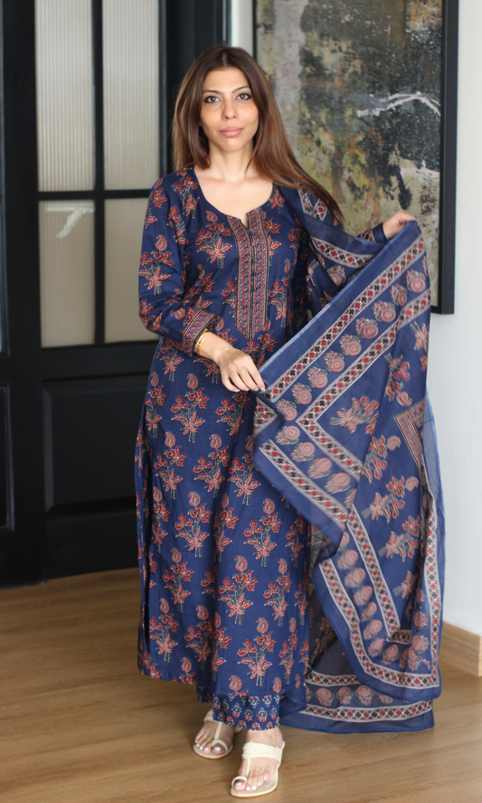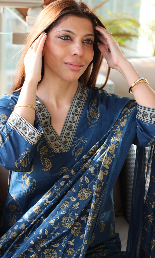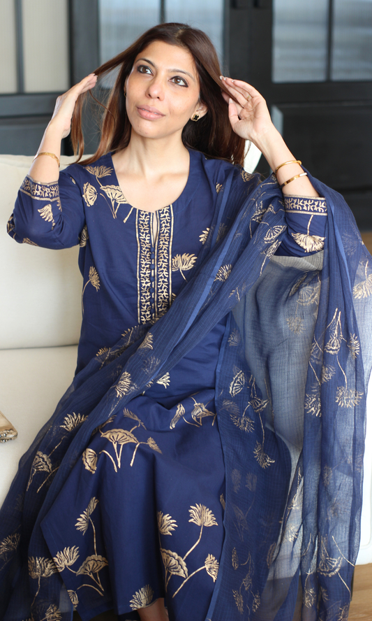 Navy Rangreza Gold Handblock Mughal Print Kurta, Cotton Pants & Kota Doria Dupatta