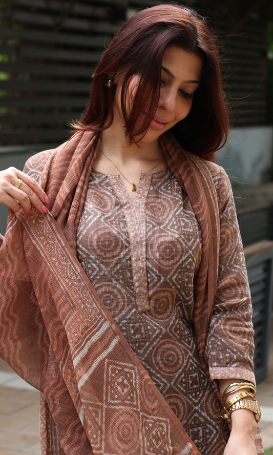 Kota Doria Sandalwood Handblock Print Kurta, Dupatta with Cotton Pants