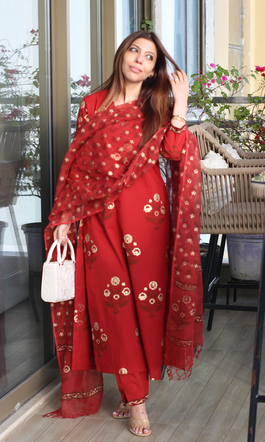 Red Rangreza Gold Handblock Mughal Print Kurta, Cotton Pants & Kota Doria Dupatta