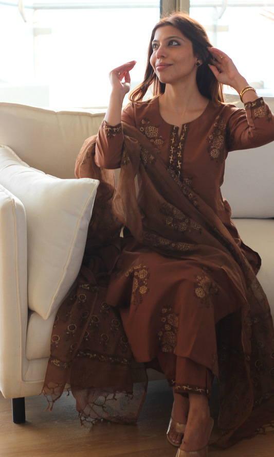 Cocoa Rangreza Gold Handblock Mughal Print Kurta, Cotton Pants & Kota Doria Dupatta