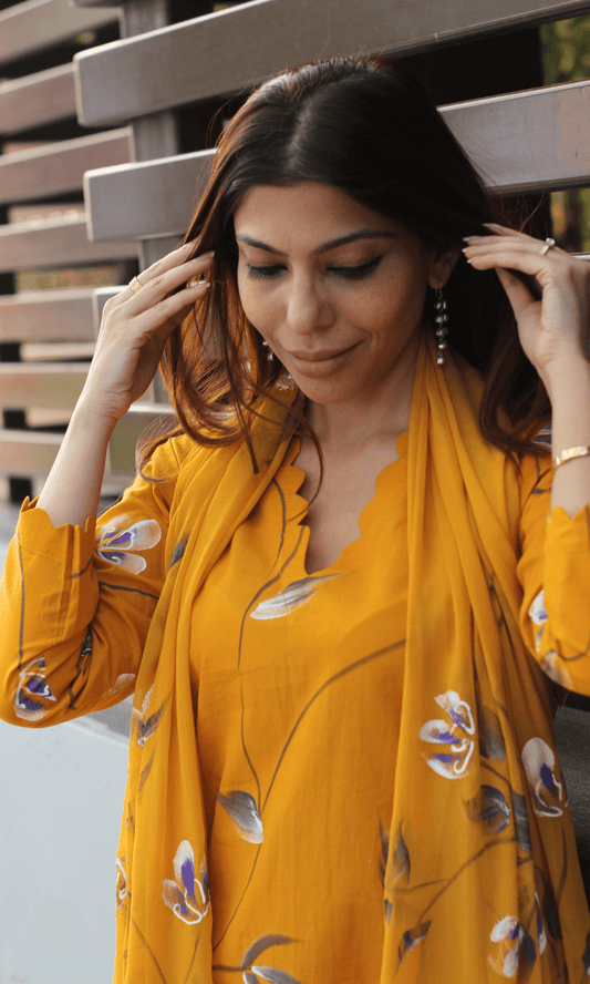 Linen Blend Butter Yellow Abstract Print Kurta , Dupatta & Cotton Pants