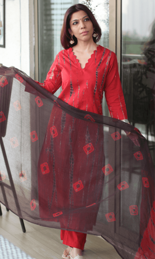 Red Romance Dabu Texture Cotton Kurta, Pant & Kota Doria Shibori Dupatta