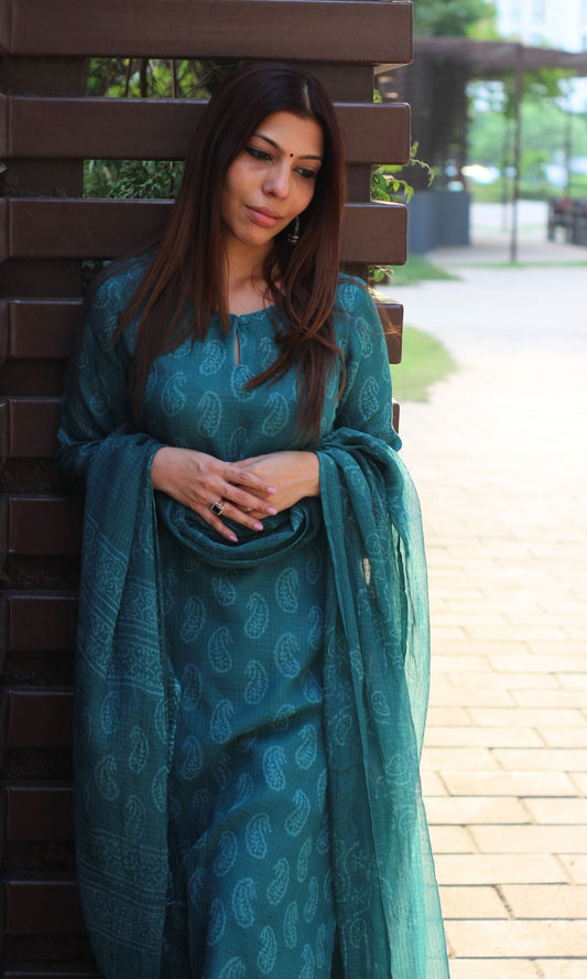 Kota Doria Handblock Teal Kurta and Dupatta with Cotton Pants