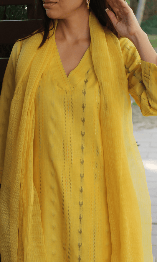 Yellow Cotton Lurex Ikkat Print Suit Set with Kota Doria Dupatta