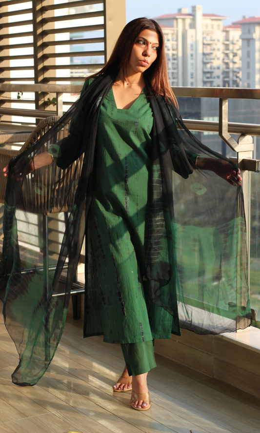 Deep Green & Black Tie & Dye Kurta, Shibori Chiffon Dupatta & Cotton Pants