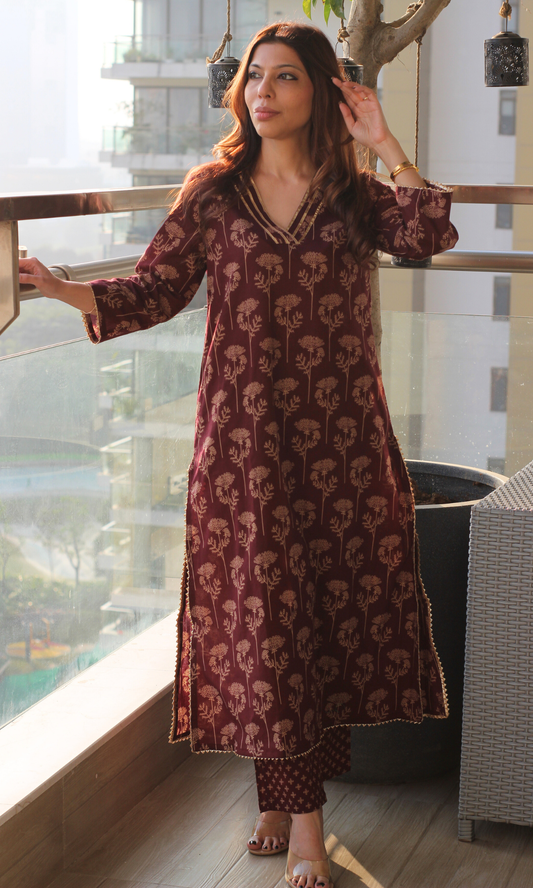 Cotton Wine & Gold Mughal Print Kurta & Pant