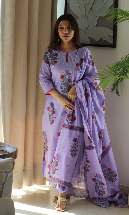 Cotton Lavender Dotted Flower Print Suit with Chiffon Handblock Print Dupatta