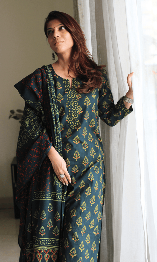 Cotton Muted Blue Hand Block Mughal Print Kurta, Dupatta & Cotton Pants