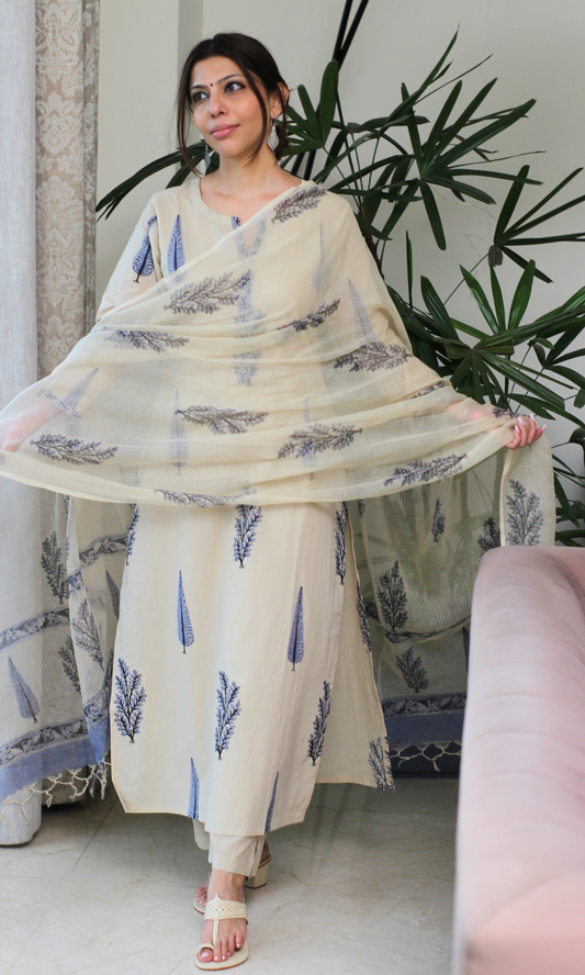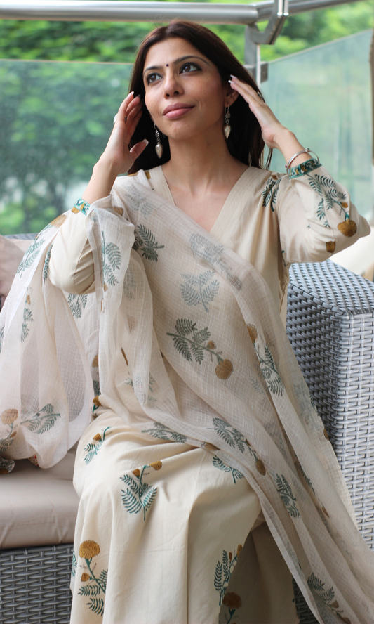 Sangria Baagh Printed Cotton Kurta, Pant & Kota Doria Dupatta