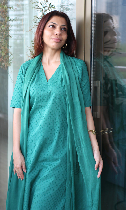 Cotton Bottle Green Dobby Half Sleeves Kurta, Cotton Pants & Chiffon Dupatta