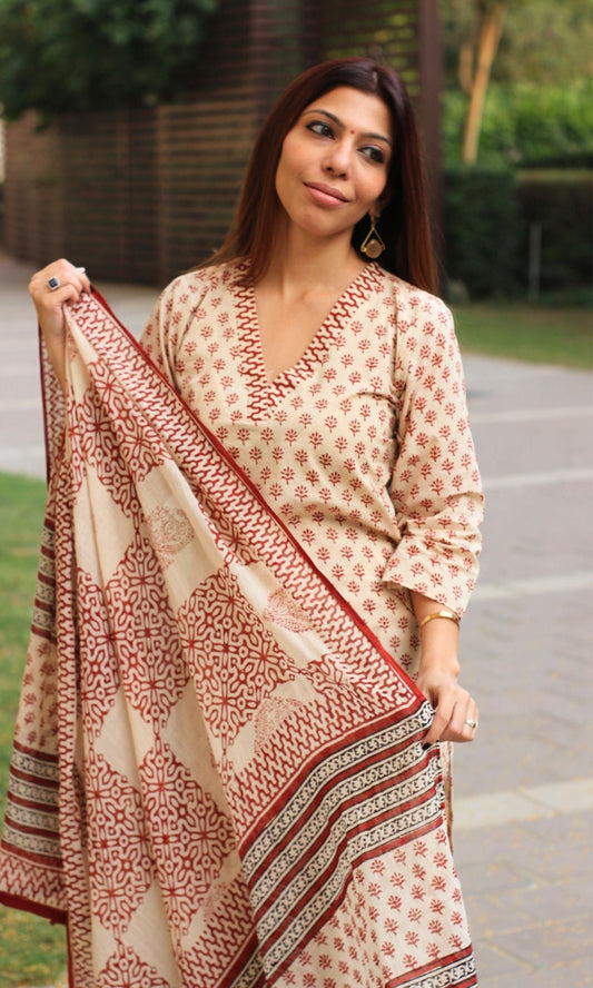 Vintage Maroon Handblock Print kurta, Kota Doria Dupatta & Cotton Pants