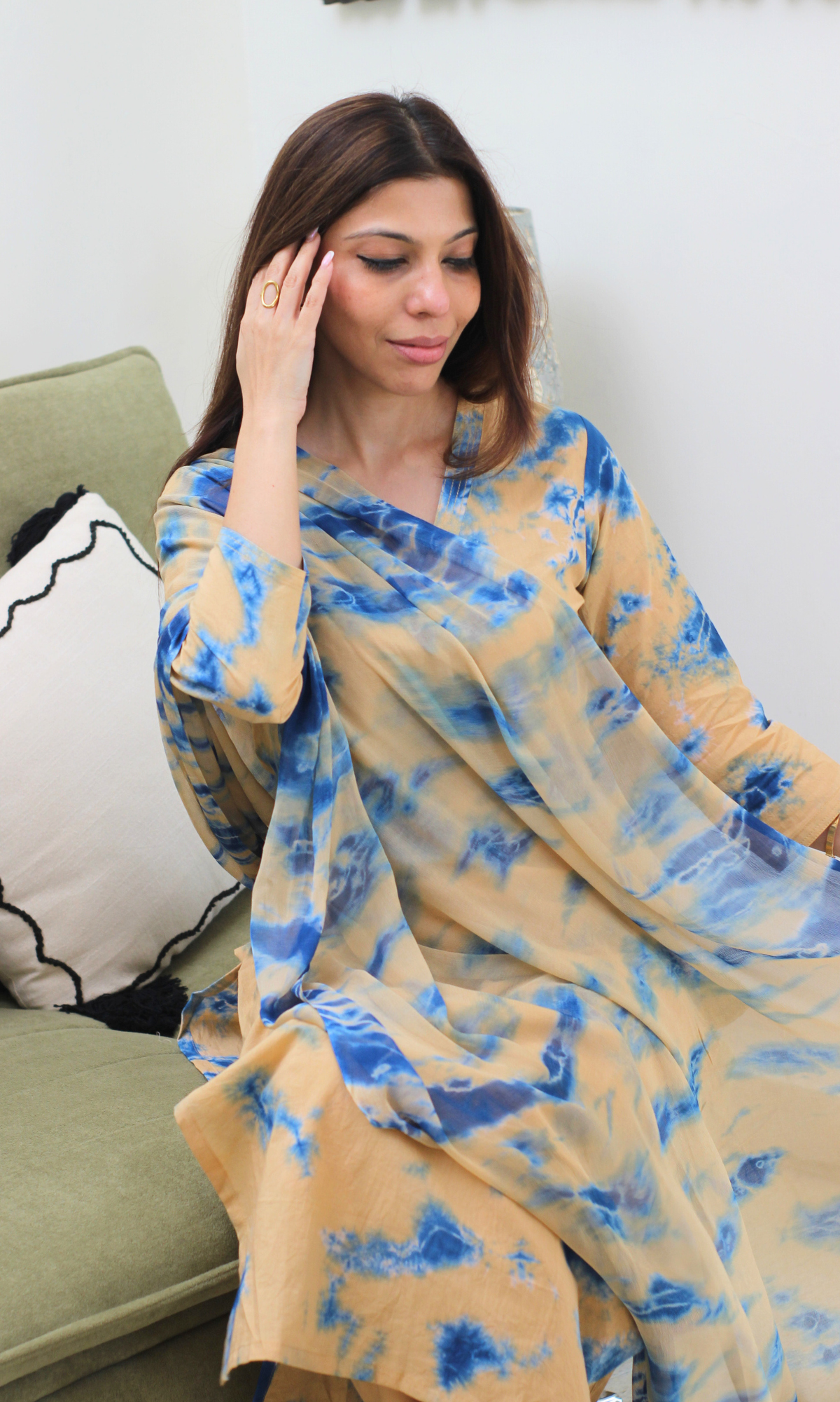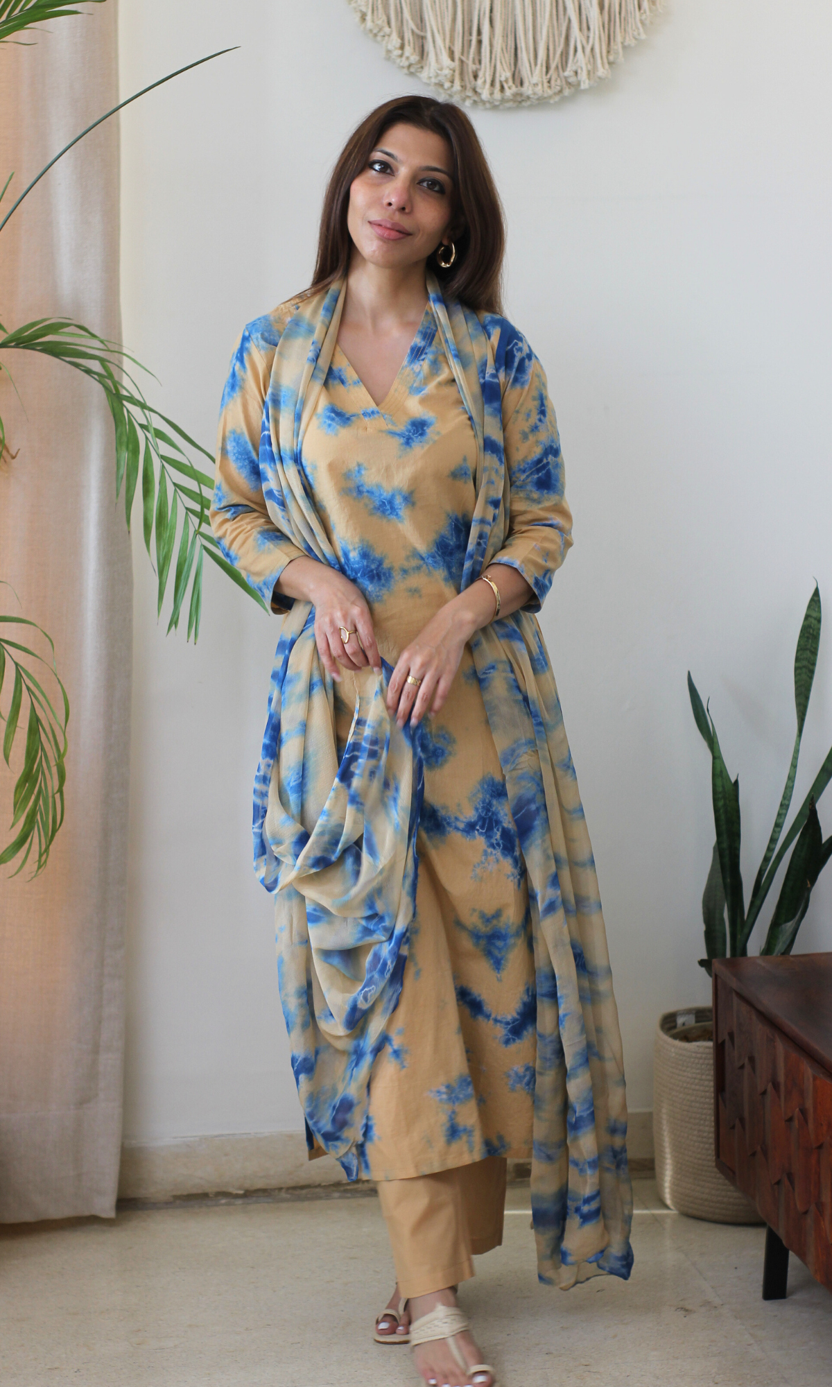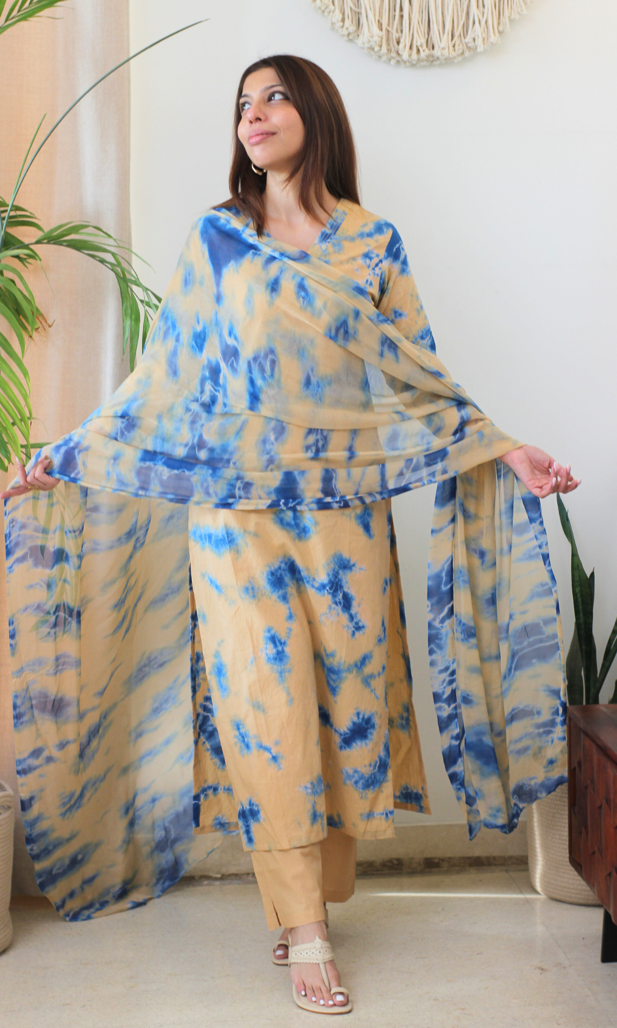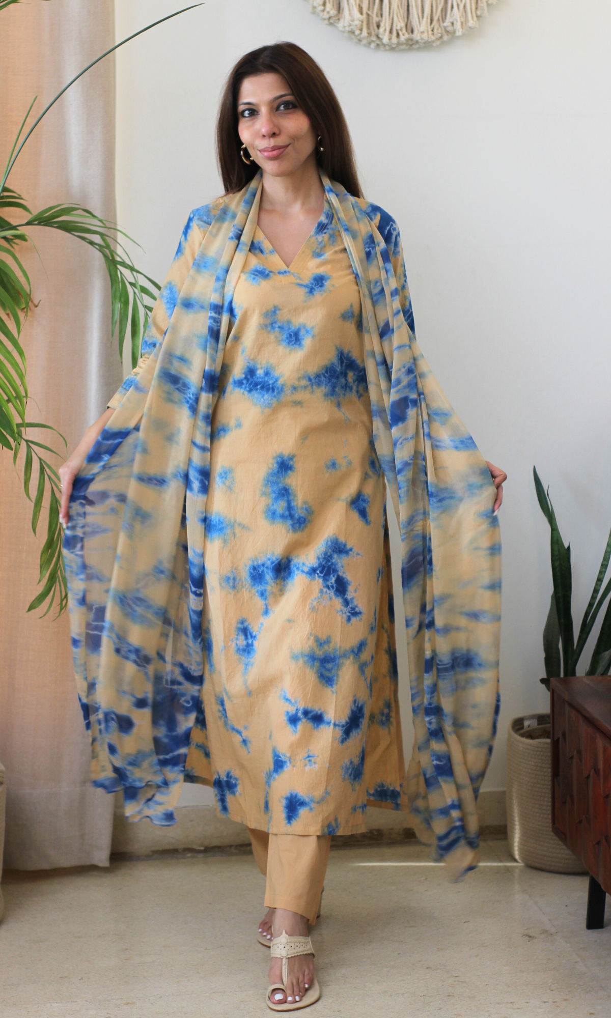 Cotton Amber Indigo African Shibori Kurta, Chiffon Dupatta & Cotton Pants