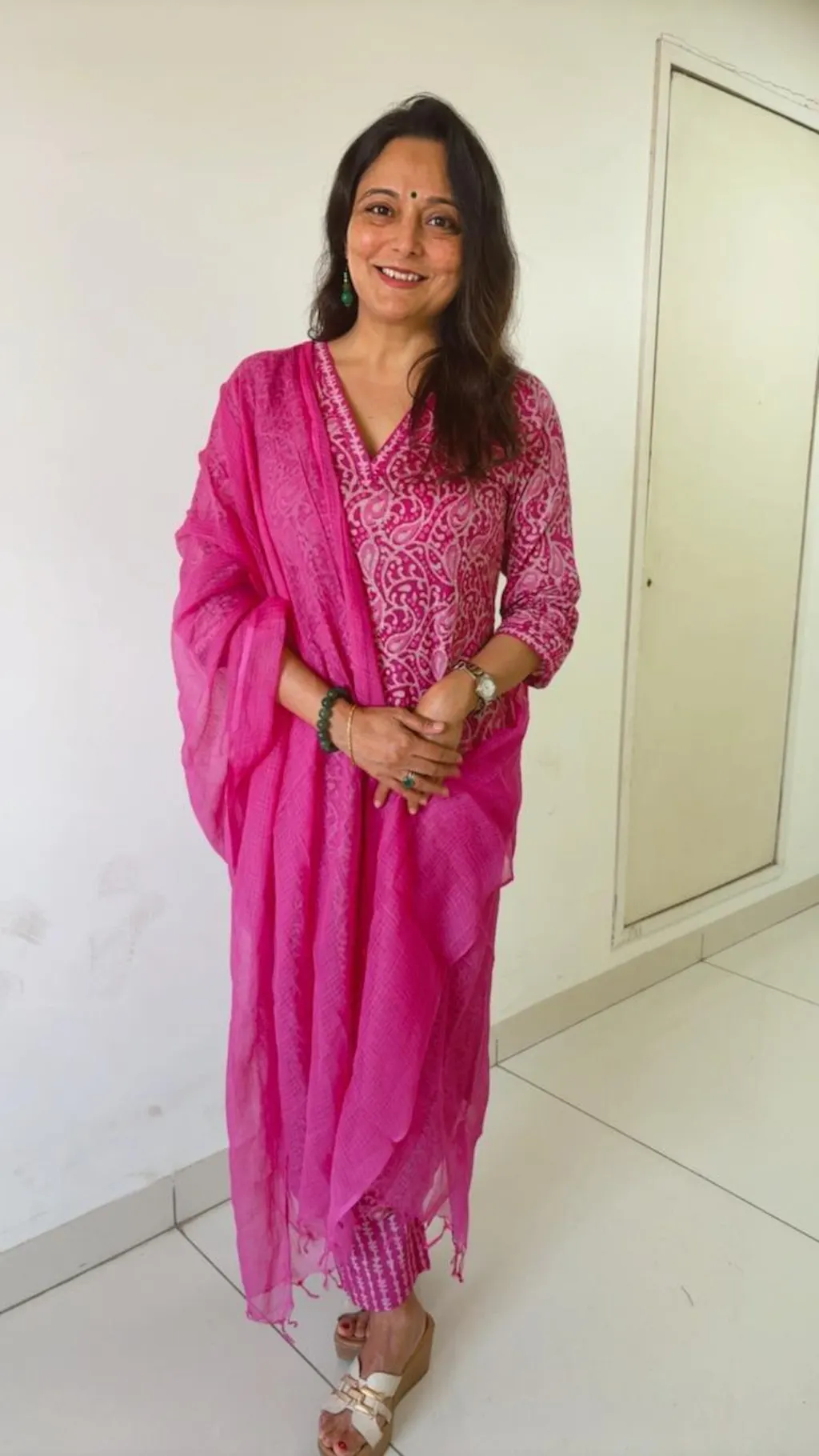 Cotton Dabu Print Pink Suit Set with Kota Doria Dupatta