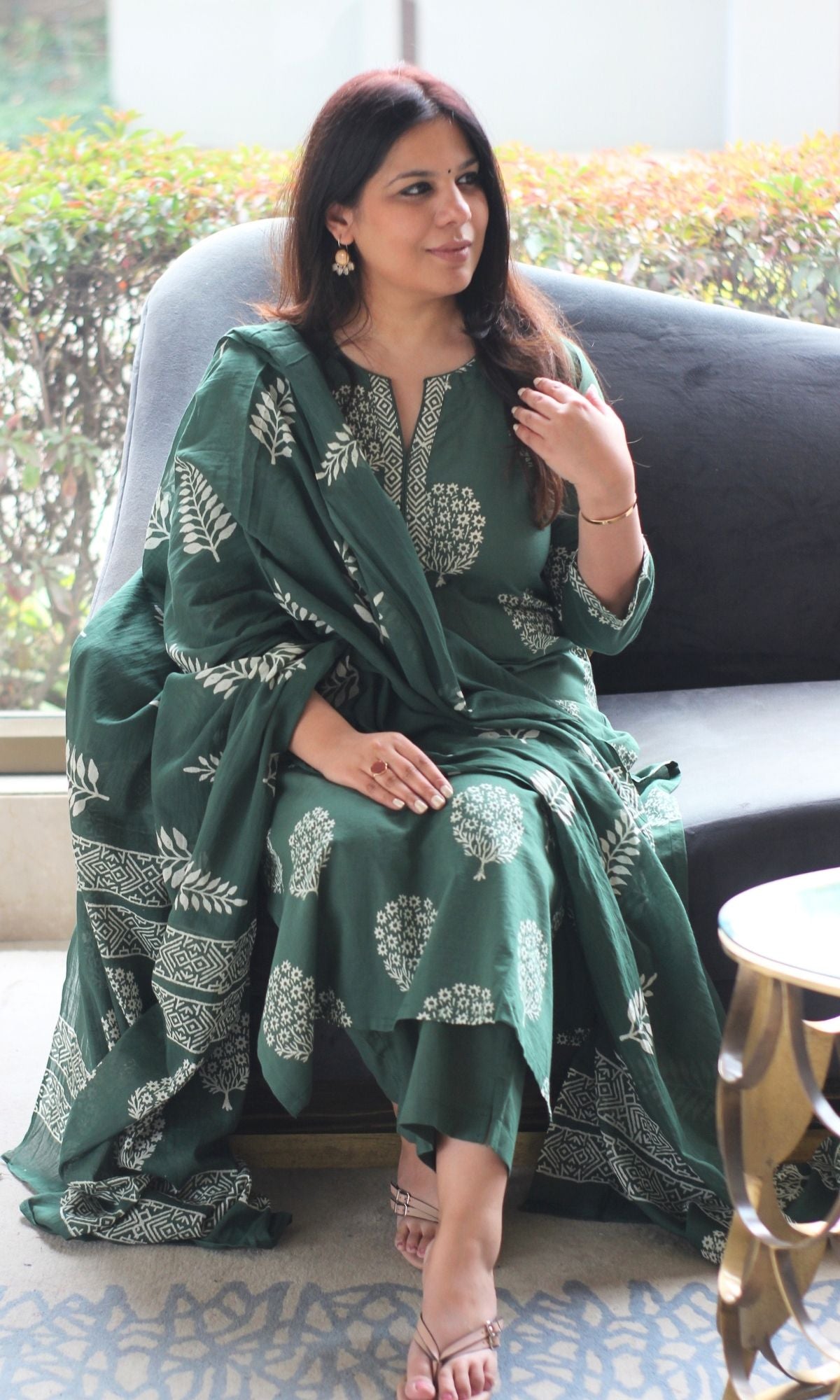 Cotton Handblock Green Mughal Oak Print Suit with Cotton Handblock Printed Dupatta