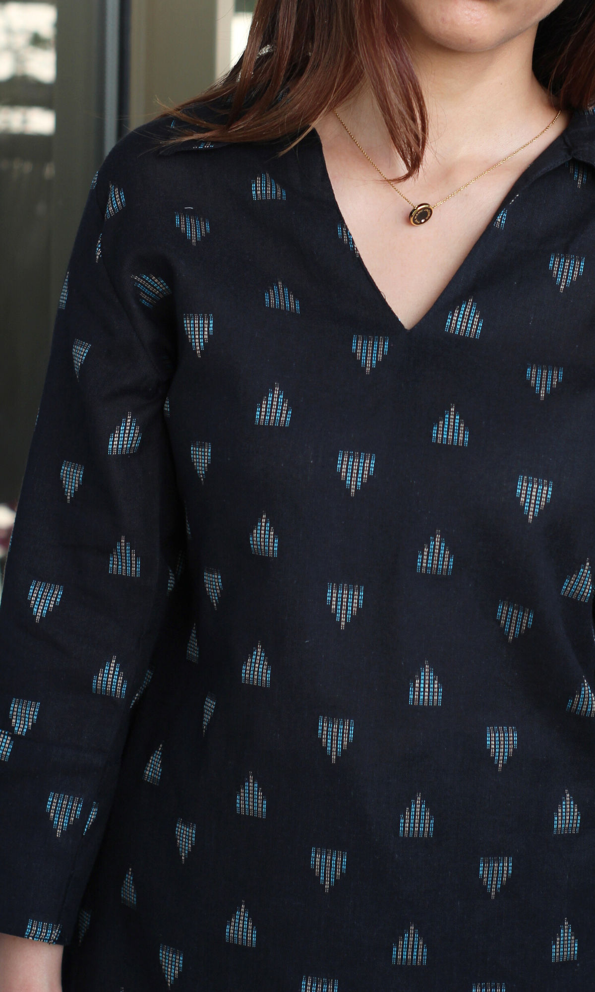 Cotton Ikat Black & Blue Triangle Collared Kurta & Pant