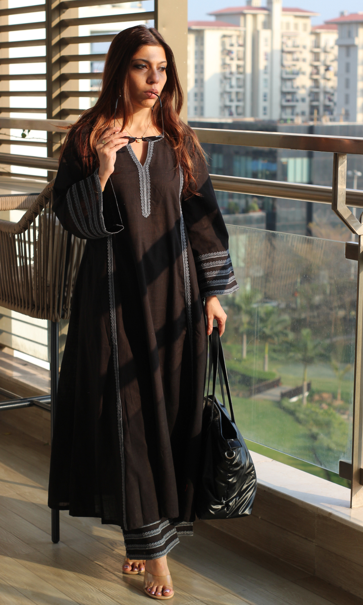 Cotton Slub Black Laced Kali Kurta with Laced Palazzo