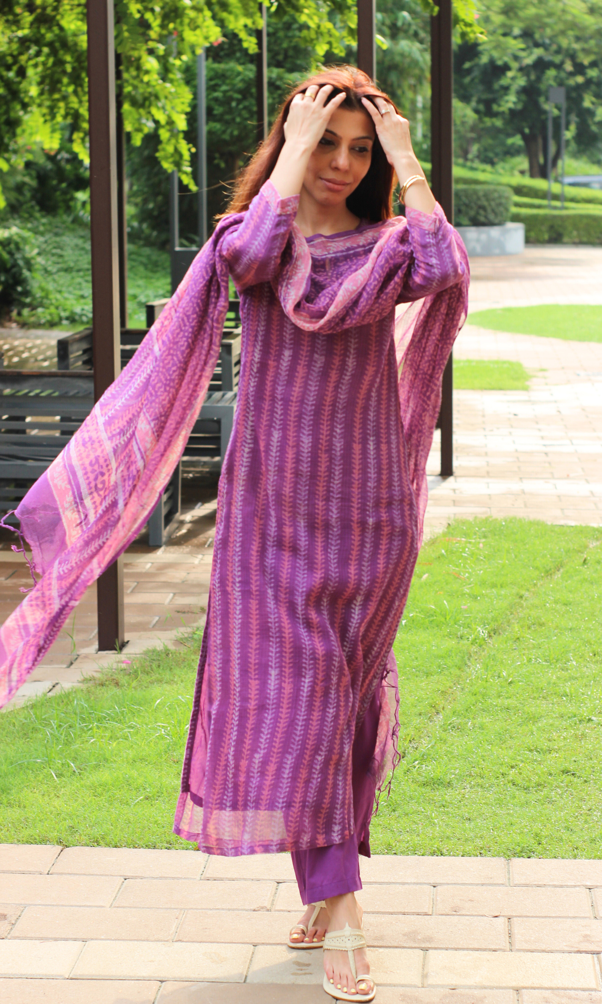 Kota Doria Plum Handblock Print Kurta, Dupatta with Cotton Pants
