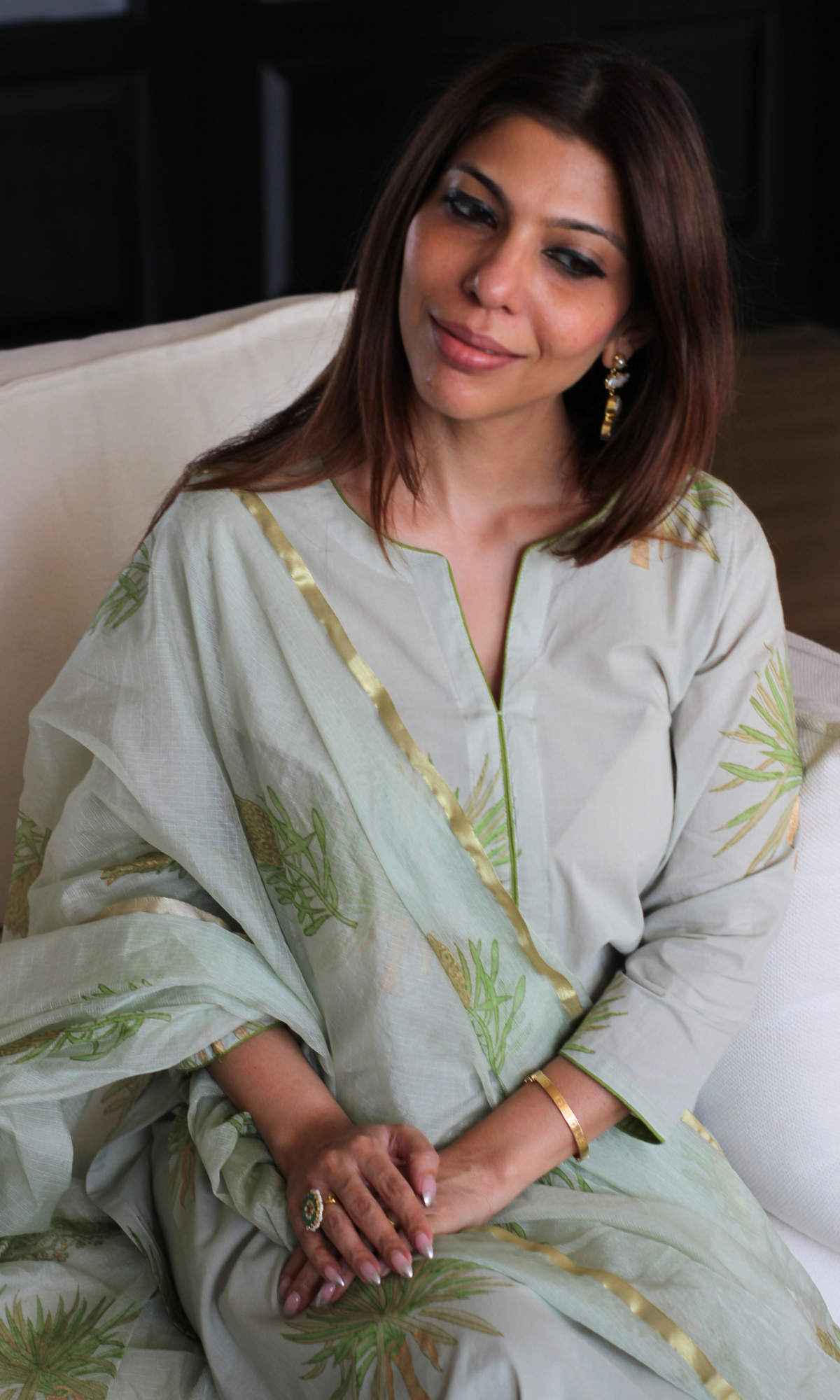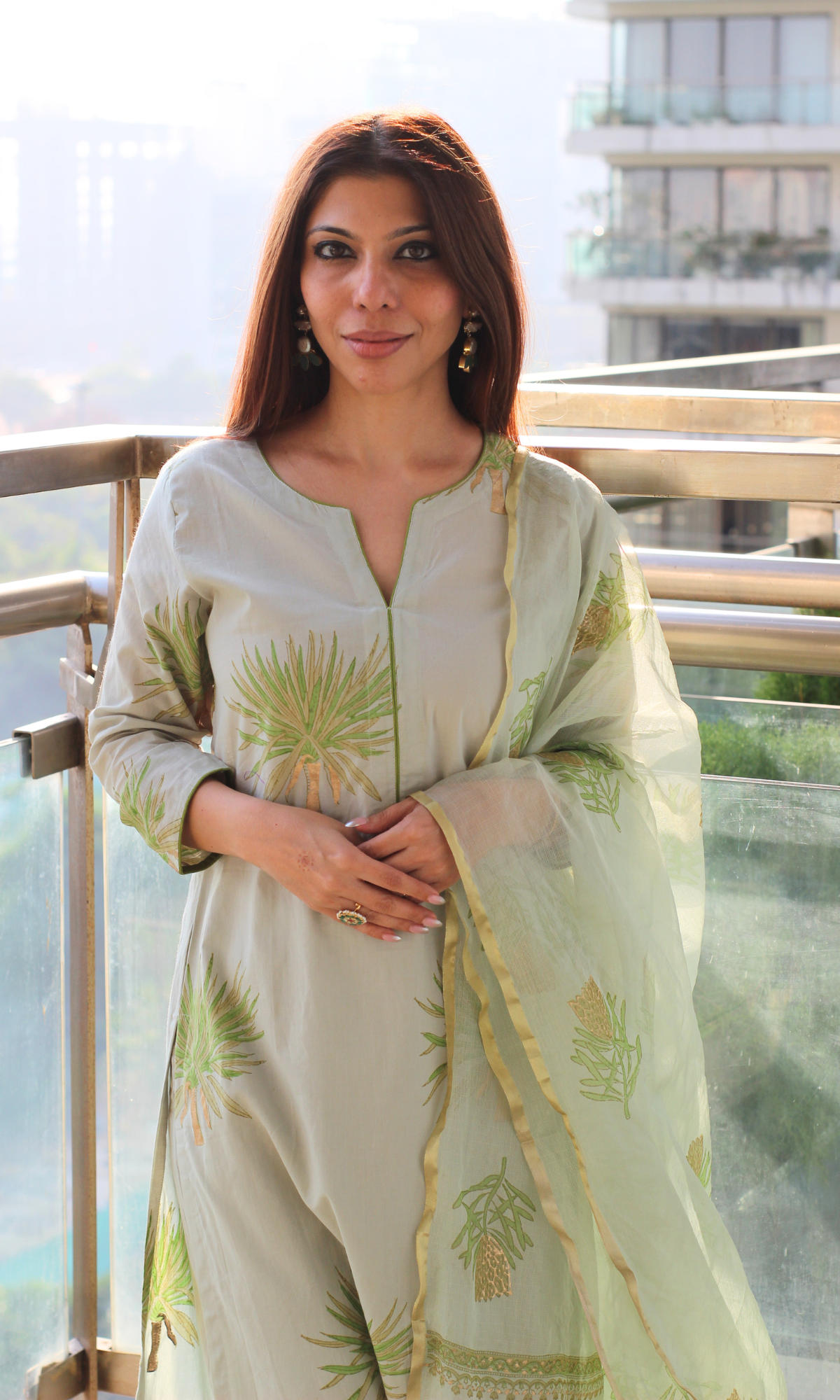 Noori Pista Handblock Mughal Gold Print Kurta, Kota Silk Dupatta & Cotton Pants