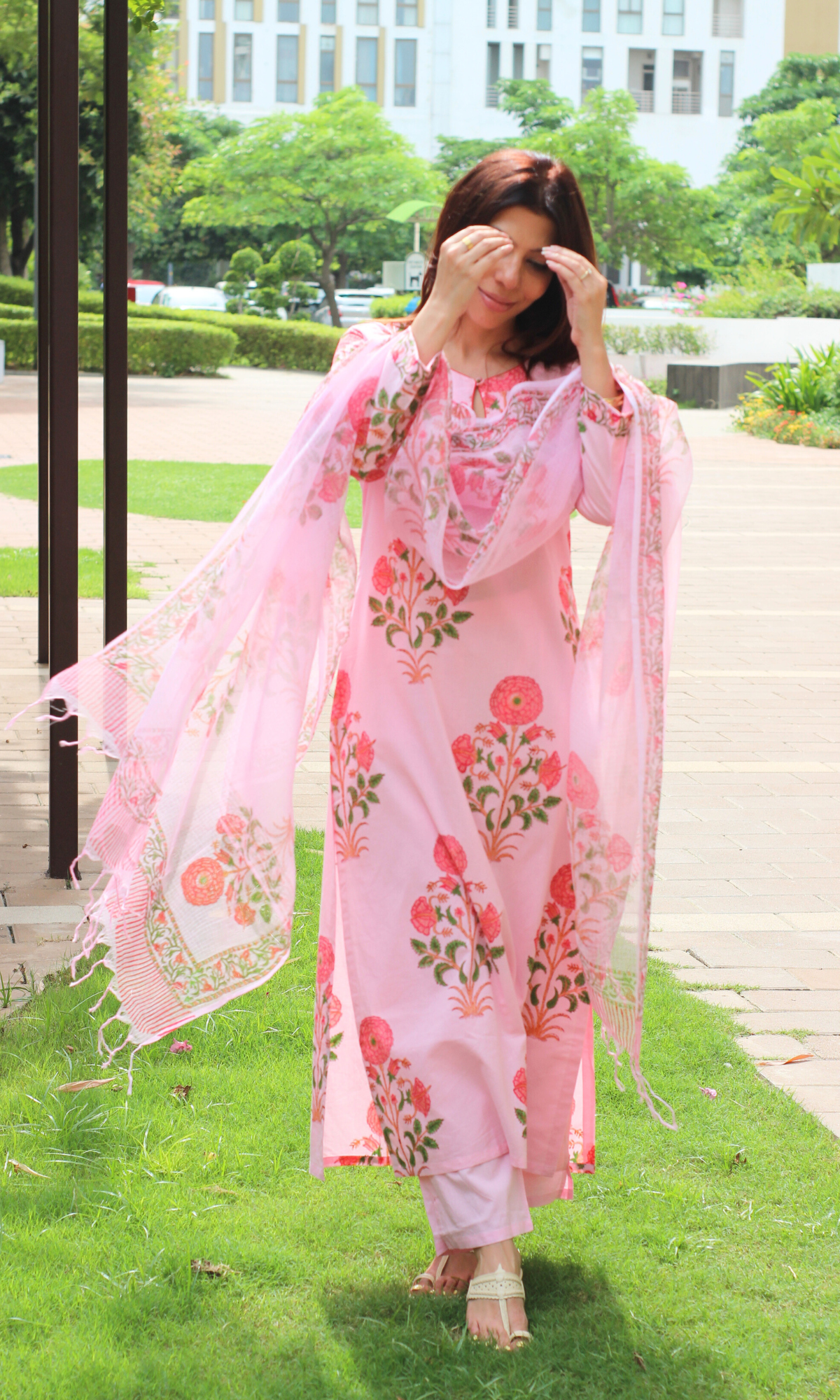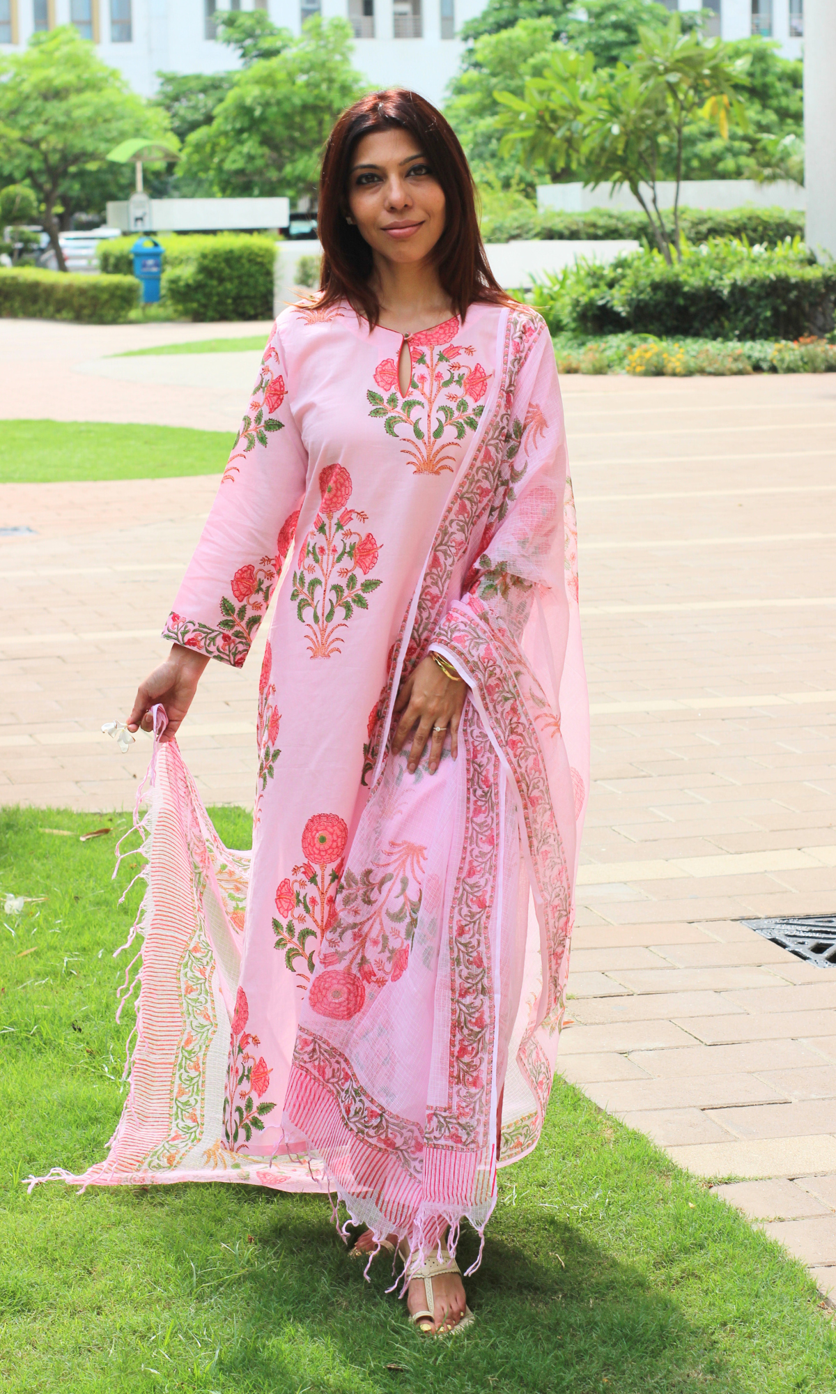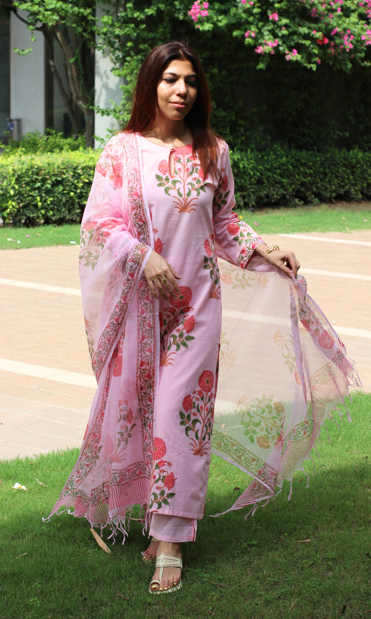 Pink Handblock Mughal Print Cotton Kurta, Pant & Kota Doria Dupatta