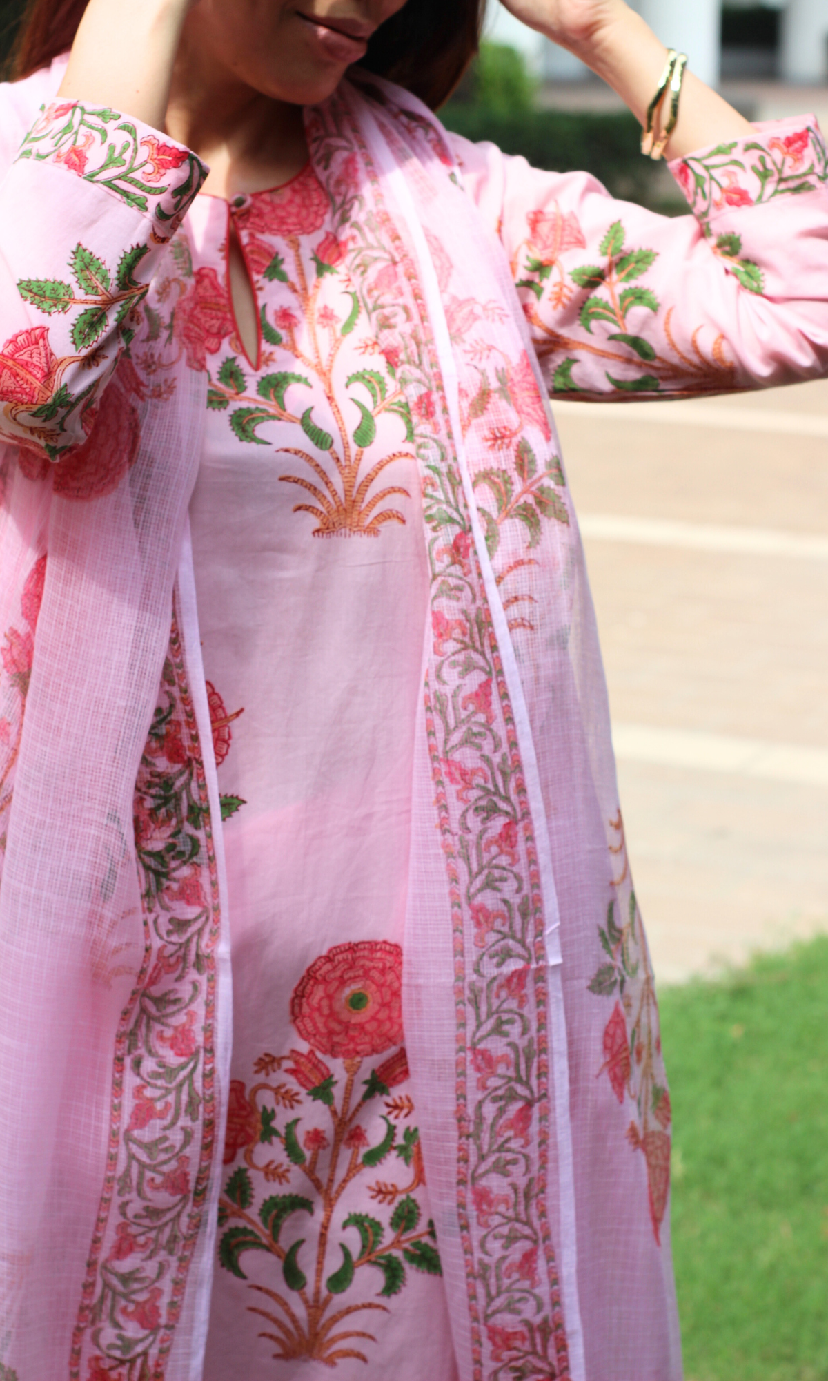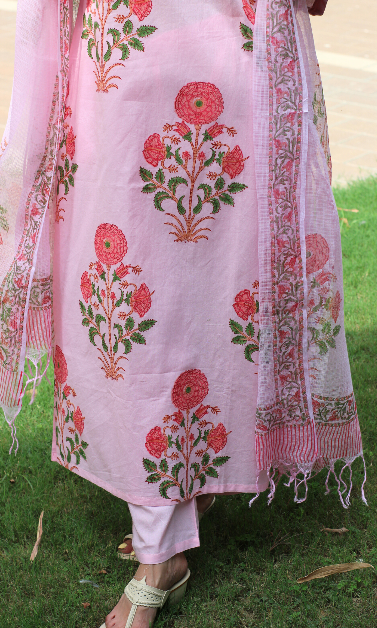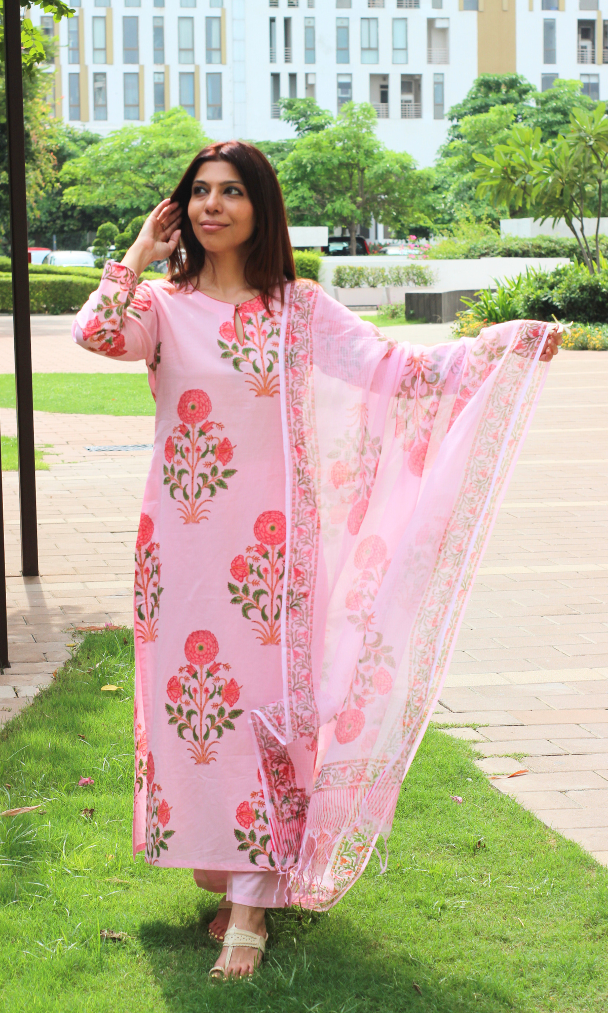 Pink Handblock Mughal Print Cotton Kurta, Pant & Kota Doria Dupatta
