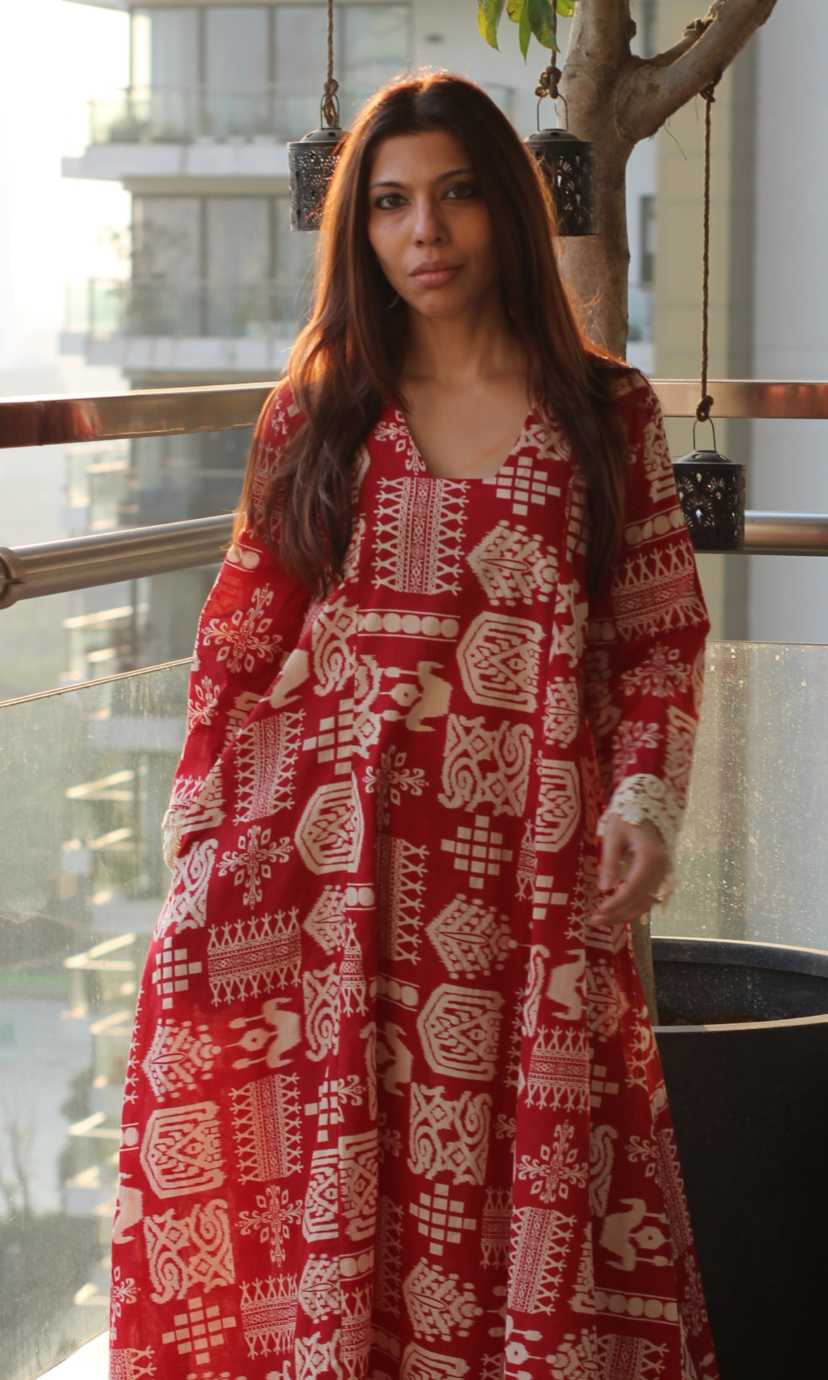Red Tribal Printed High Low Cotton Kurta with Pants