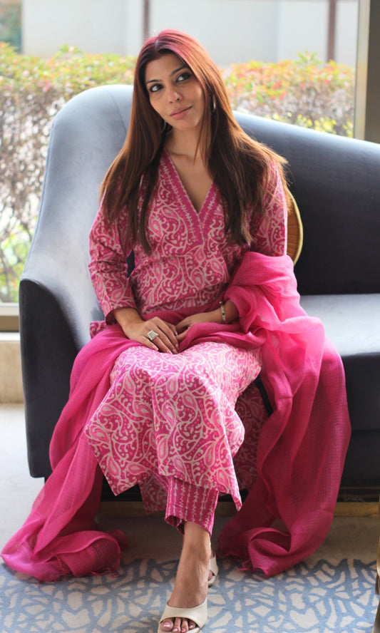Hot Pink Cotton Hand Block Print Kurta , Kota Doria Printed Dupatta & Cotton Pant